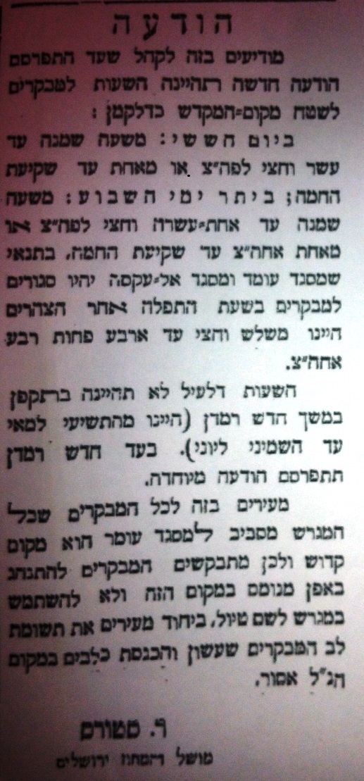 - Closing the gates – During the 1970s, tourists could enter the Temple Mount through the Chain Gate and the Cotton Gate, and not just through the Mughrabi Gate, which is the only way today. At a certain point, the Muslims closed the two other gates, only allowing Muslims to pass through them to the Temple Mount.